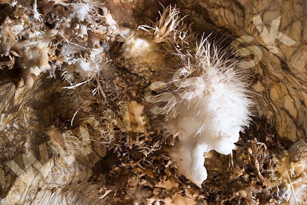 V jaskyni sa zistili tri generácie aragonitu. Tvorí sa z vodných roztokov s vysokým obsahom Mg-, Fe- a Mn-iónov v podmienkach stabilnej mikroklímy. Najstaršie sú mliečno zakalené obličkovité útvary a ich korodované zvyšky (datovaný vek 121- až 138-tisíc rokov) s čiastočne rekryštalizovaným aragonitom, miestami premeneným na kalcit. Najviac zastúpená je druhá generácia aragonitu, ktorý sa vyskytuje v podobe niekoľko dm dlhých ihlíc a zakrivených až špirálovitých heliktitov (datovaný vek 14-tisíc rokov). Tieto vytvárajú trsovité alebo kríčkovité útvary (vrátane tzv. železného kvetu), ktoré sú pre návštevníkov najatraktívnejšie. Aragonit druhej generácie stále dorastá, čím si udržuje bielu farbu a čistý vzhľad. Najmladšia generácia aragonitu, ktorý sa v súčasnosti tvorí na sedimentoch a železitých okroch, vytvára drobné vejáriky (veľké 2 až 4 mm, miestami i väčšie), ojedinele miniatúrne špirálovité útvary.