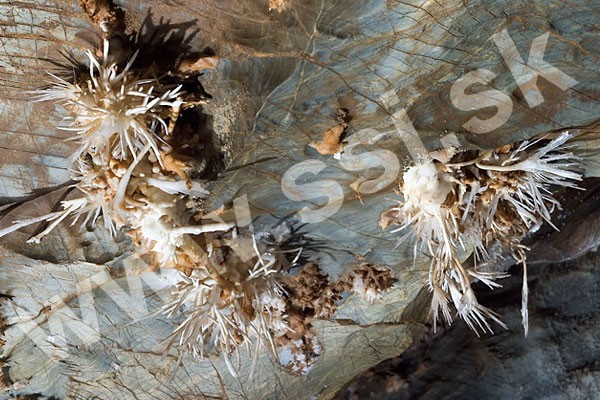 W jaskini stwierdzono trzy generacje nacieków aragonitowych. Powstają one w wodnych roztworach z wysoką zawartością jonów Mg, Fe i Mn w stabilizowanych warunkach mikroklimatycznych. Najstarszą generację stanowią masywne, białe, na powierzchni mleczno zabarwione elipsoidalne formy, które często występują jako korodowane relikty większych polew na stropie komór jaskiniowych (mają wiek od 121 do 138 tys. lat). Aragonit je budujący jest częściowo zrekrystalizowany i miejscami zmieniony w kalcyt. Najliczniejsza jest druga generacja nacieków aragonitowych. Tworzą ją nacieki w kształcie igieł i spiral (o wieku ok. 14 tys. lat). Wytwarzają one krzaczkowite twory (włączając tzw. żelazny kwiat), który jest dla zwiedzających najatrakcyjniejszy. Nacieki te są stale zasilane przez wodę kapilarną, co pozwala zachować ich biały kolor. Najmłodsza generacja aragonitu, która obecnie powstaje na osadach ilastych i skupieniach ochr, występuje jako formy wachlarzyków o rozmiarach 2-4 mm lub czasami większe oraz jedyne w swoim rodzaju miniaturowe spirale.