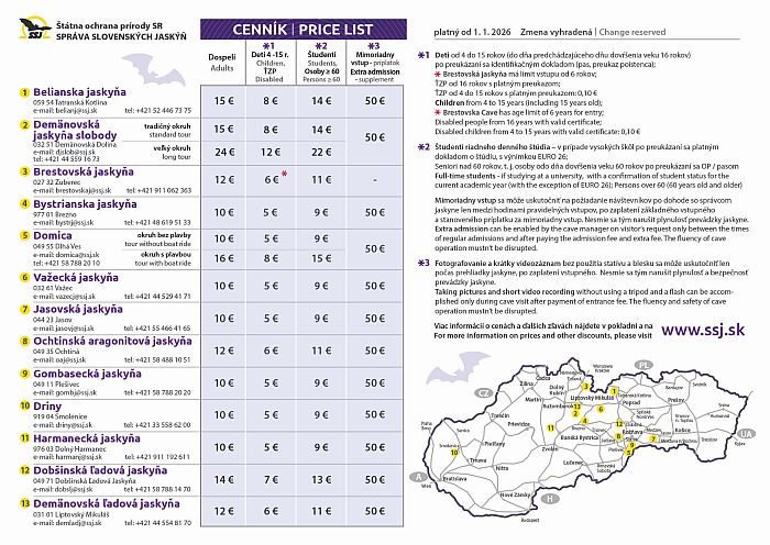 ceníme si váš záujem o naše sprístupnené jaskyne a keďže chceme, aby ste sa počas ich návštevy cítili príjemne a intenzívnejšie vnímali krásy podzemnej prírody, zrušili sme od 1.1.2026 poplatky za fotografovanie/filmovanie v rámci bežnej prehliadky. Neznamená to však predĺženie času prehliadky a poprosíme o dodržiavanie pokynov našich sprievodcov. Prajeme príjemný zážitok!
